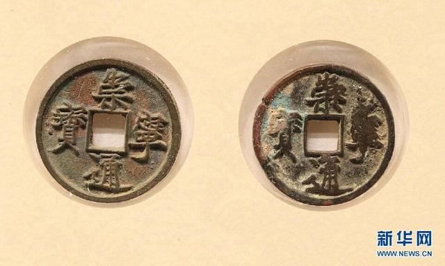“崇寧通寶”,北宋徽宗趙佶以其自創的“瘦金體”親筆御書的錢文。新華網發(侯新建攝)