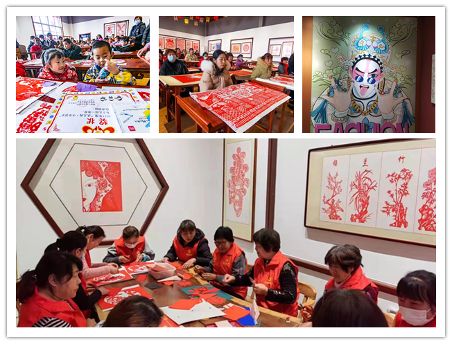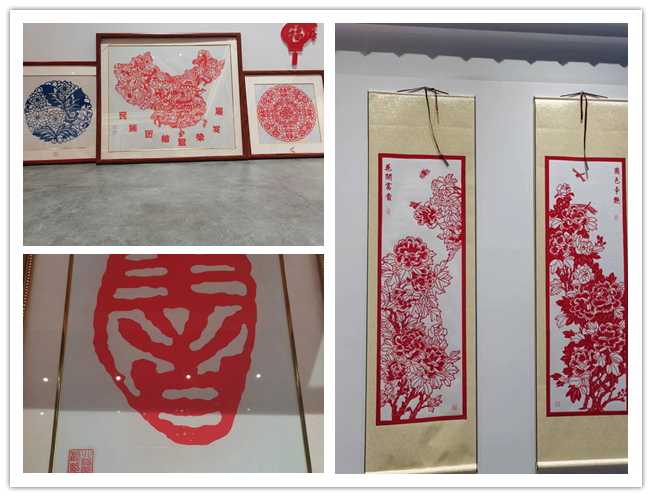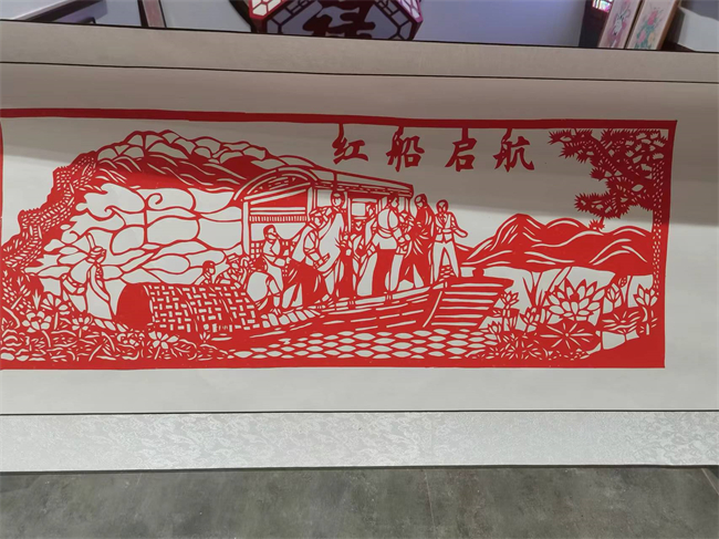 眾多精湛的剪紙藝術精品引得游客駐足流連,無不為之動容,感慨萬千。建黨百年的巨幅剪紙長卷,講述了從紅船起航到邁進新時代的歷史變遷,承載著人們美好的祝愿;京劇臉譜,惟妙惟肖,彰顯著傳統的風韻;善字剪紙,浸潤著當地人的樸實情懷......