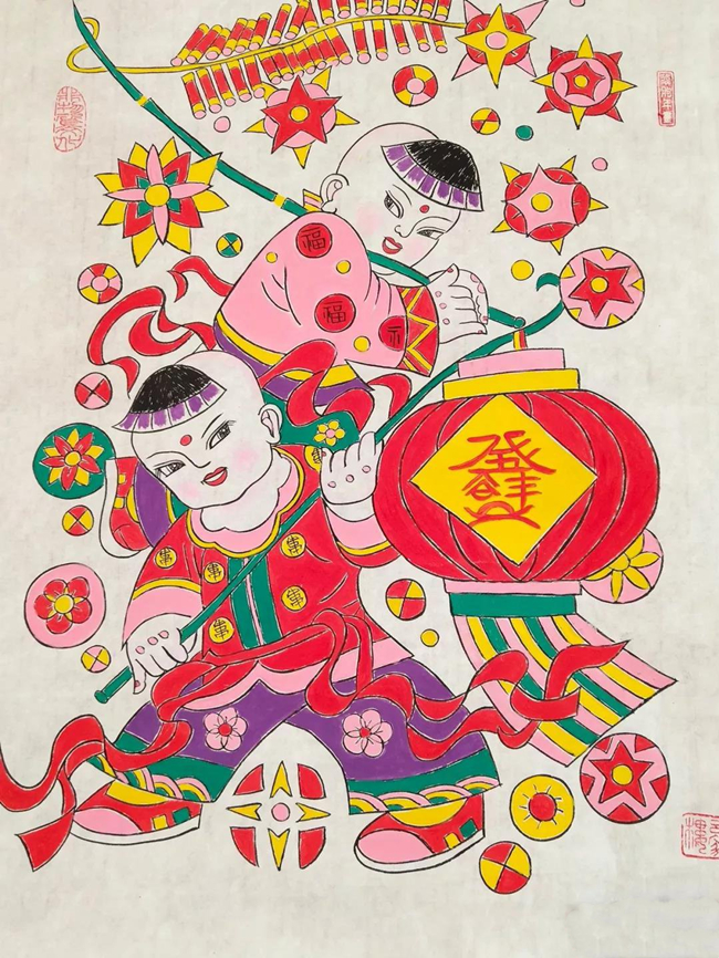 《十二生肖》系列手繪年畫古樸稚拙、《四季平安》、《連年有余》等年畫則形神兼備,美輪美奐;融入現代版畫因素的《舞獅》虛實結合,華美典雅;《綠色出行》、《歡樂潮》則是對當下時代的反映和描摹……盛世文化興,臨朐手繪年畫再次迎來了發展的春天,手繪年畫已成為臨朐一個獨特的文化徽標。