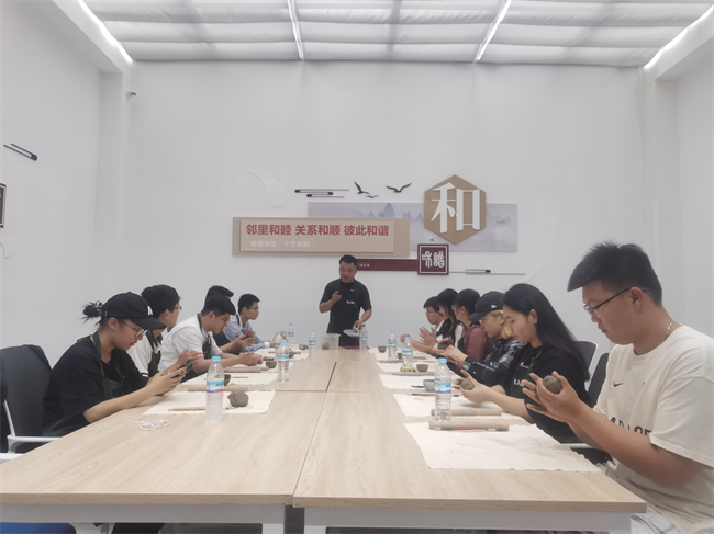同樣在傳承基地內的另一側,龍山陶藝制作課堂正在進行,來自市中區的十多位大學生們正在這里跟隨傳承人學習做陶藝臉譜。