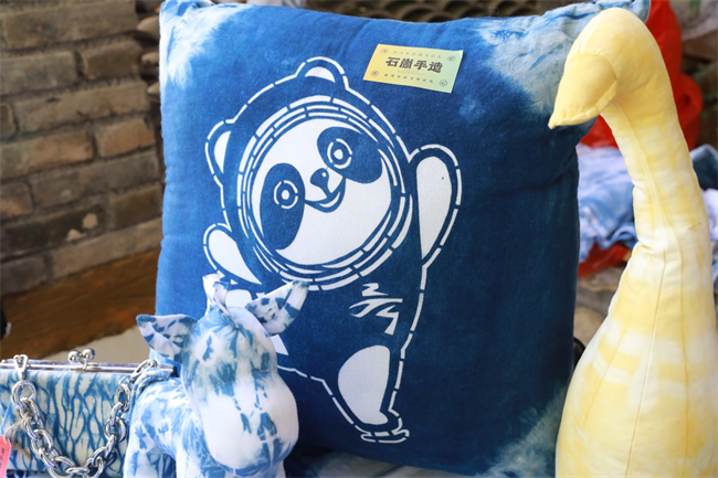 石崮手造集市上擺放的“冰墩墩”扎染作品