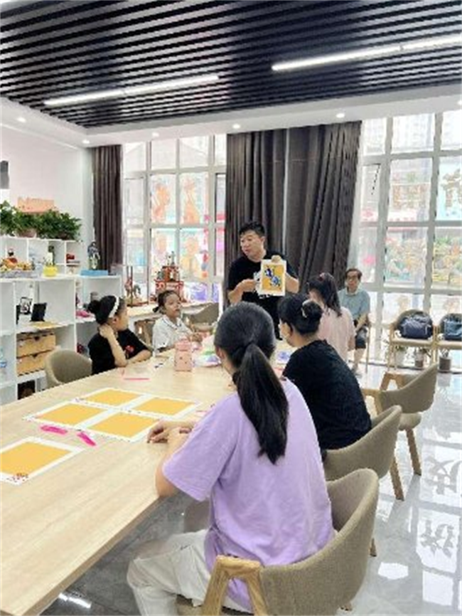 位于濟南市中區萬達商圈里的魏家莊黨群服務中心,是濟南市首批泉城文化驛站之一。2021年,魏家莊社區成立非遺傳承基地,由國家級非遺項目濟南皮影,省級非遺項目面塑、剪紙,另有布藝、串珠、古船修復、核雕、結藝、刻瓷、絲網花等民俗手藝人及團隊組成。每月固定開展非遺民俗體驗課程,包含不同項目,上述的親子學習課程就是其中一項。