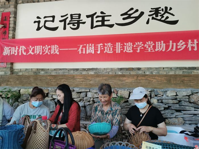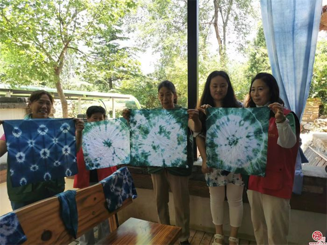 在石崮溝村的“石崮手造體驗活動”現場,幾位大姐正在互相交流她們的扎染“處女作”,臉上掛滿了笑容。村民們在非遺傳承人的帶領下認真學習柳編、面塑、泉水扎染、香包等各項技藝,熱情高漲,好不熱鬧!