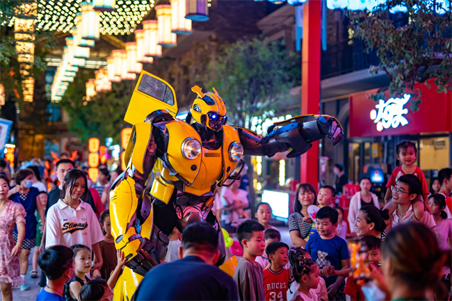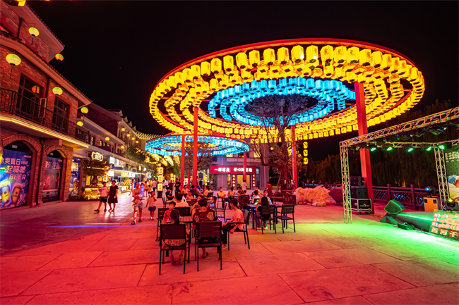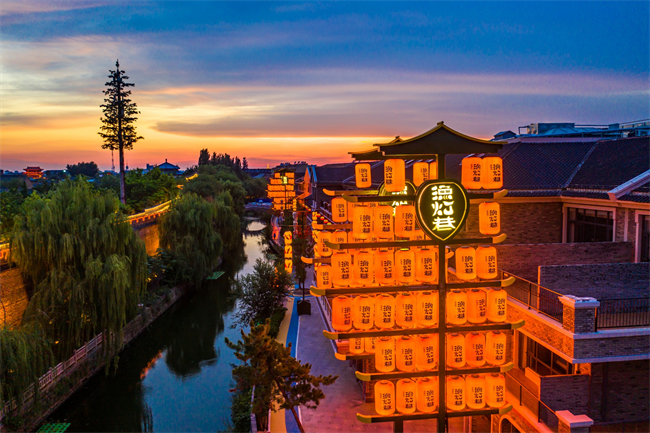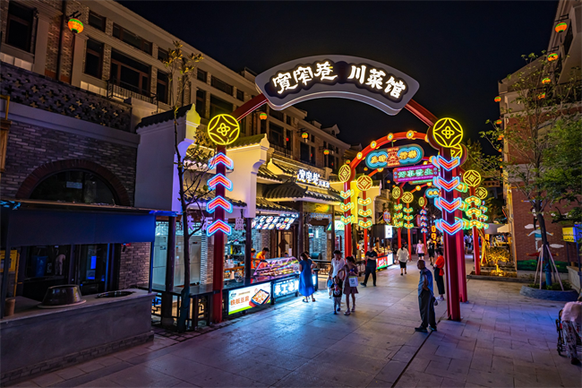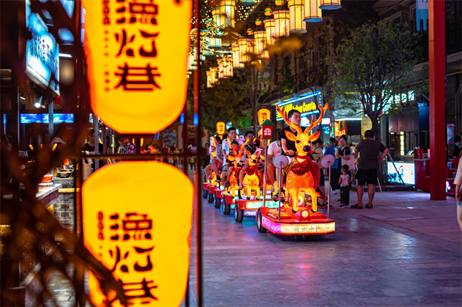 夜幕降臨,踏入街區只覺漁燈美若星河,不同朝代風貌交疊,不同業態繽紛多彩,宛若一幅當代版的“清明上河圖”。