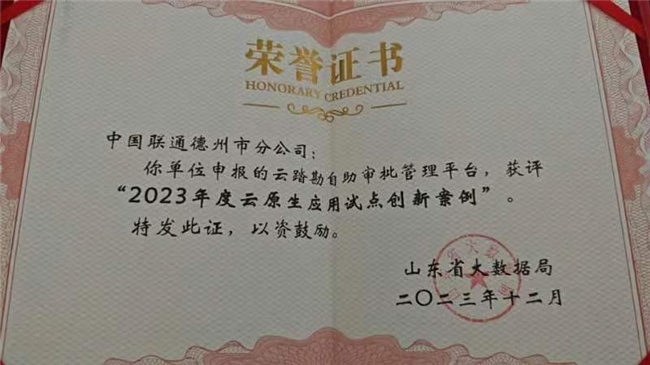 近日,德州聯通自主研發的“云踏勘自助審批管理平臺”,在山東省大數據局舉辦的2023年度原生應用試點評選活動中脫穎而出,榮獲“山東省2023年度原生應用試點創新案例”。