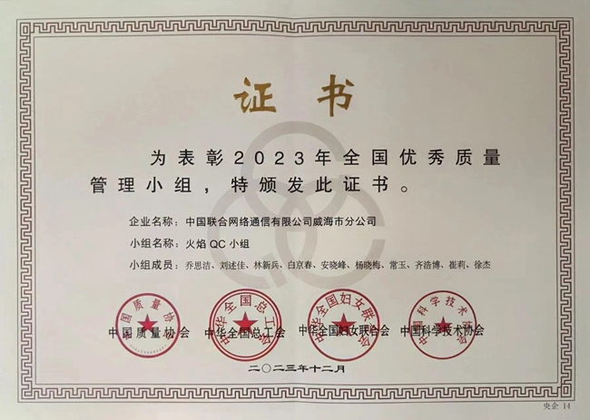 喜報!威海聯通再獲質量管理“國字號”一等獎