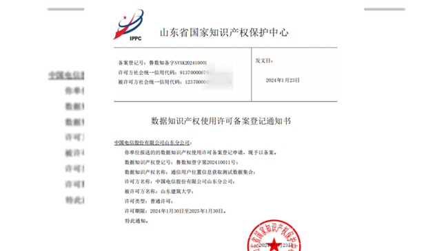 1月24日,濟南高新區數據知識產權許可案例發布暨數據知識產權流通促進工作站揭牌儀式在山東省知識產權公共服務平臺舉辦,全省首個數據知識產權使用許可案例成功發布。此項數據知識產權許可方是中國電信山東公司,被許可方是山東建筑大學,該數據知識產權將具體運用在通過精確定位到問題頻繁發生地,幫助管理者有針對性地開展安全隱患排查,切實做到問題早發現、早處置、早規范,為社會和諧穩定及校園安全提供有力保障。