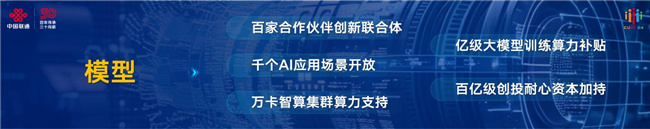 模型是智能新時代的核心能力。中國聯通打造百家合作伙伴創新聯合體,開放千個AI應用場景,提供萬卡智算集群算力支持,推出億級大模型訓練算力補貼,加持百億級創投耐心資本,提供更懂行業、更易定制、更加可信的AI工具。