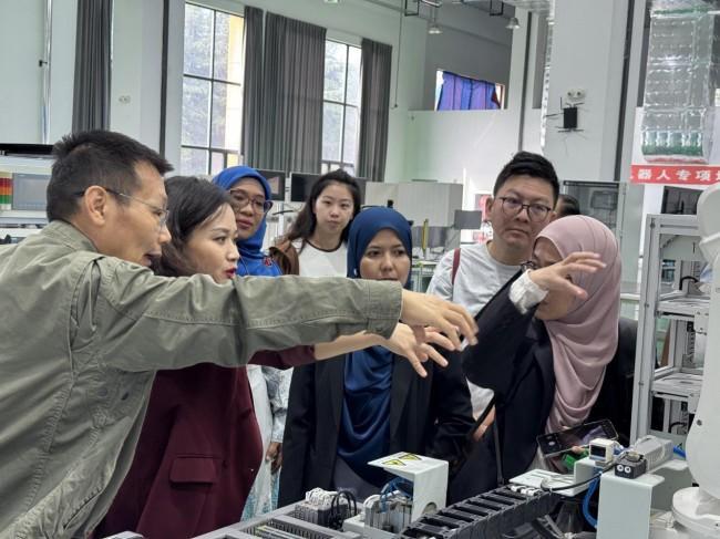 為使理論落地,濟南工程職業技術學院開放了機電工程、軌道交通等院系實訓中心。在高度仿真的現代化實訓室里,馬來西亞學員們親眼見證了智能機器人精準操作,并親手體驗了關鍵實踐環節。濟南工程職業技術學院學生嫻熟的技能展示與先進的設備令他們贊嘆不已。隨后,學員們走入特別設計的雙語課堂,在“理論講解+實操演示”的沉浸式教學中,迅速掌握了技能要點。這種“眼見為實、動手為證”的教學方式,讓中國職業教育的“高標準、嚴要求”深入人心。