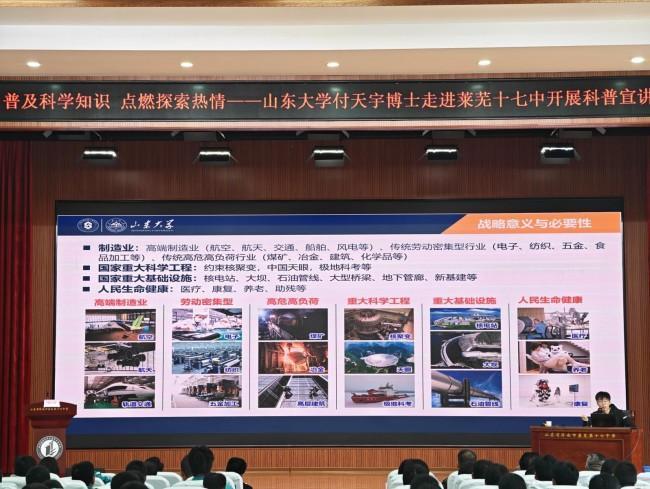 隨后,山東大學控制科學與工程學院博士后、機器人研究中心助理研究員付天宇博士聚焦機器人科普主題展開講解。付博士同時擔任濟南市工業和信息化局機器人產業發展辦公室成員,長期深耕機器人復雜作業技能學習與優化領域,尤其在機器人柔性物體操作方向開展了大量前沿研究工作。講座中,他用通俗易懂的語言解讀機器人技術的發展現狀與未來趨勢,結合自身主持或參與的5項國家級省部級項目、2項企業自研項目,以及發表的10篇SCI/EI論文、15項授權/申請發明專利和2項軟件著作權成果,為師生們呈現了一場兼具專業性與趣味性的科技盛宴,極大激發了同學們對人工智能與機器人領域的探索熱情。