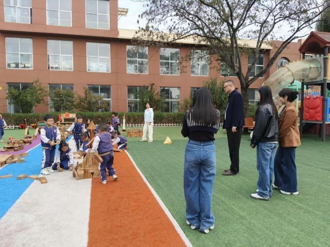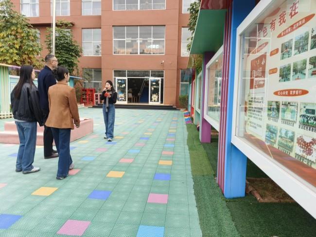 活動伊始,在園領導的陪同下,董鎮長一行首先實地觀摩了中心園的園所環境與特色活動。從充滿童趣與創意的小舞臺、安吉綜合游戲區、大型積木搭建區,到彰顯“五育并舉”理念的五色德育版面;從傳承傳統文化的棋室、茶意盎然的茶室,到功能完備的新生接待室、科學銜接的幼小銜接室;再到富有本土特色的園本教室、自由揮灑的涂鴉區、探索自然的沙水區與小山坡、充滿生活氣息的農家小院……董鎮長細致察看,頻頻駐足,對幼兒園將思政教育巧妙融入幼兒日常生活、游戲與環境創設的做法給予了高度肯定。特別是在參觀紅色文化長廊和園本黨建品牌宣傳欄時,董鎮長指出,要利用好這些身邊的紅色資源,在孩子們心中早早播下愛國愛黨的種子。