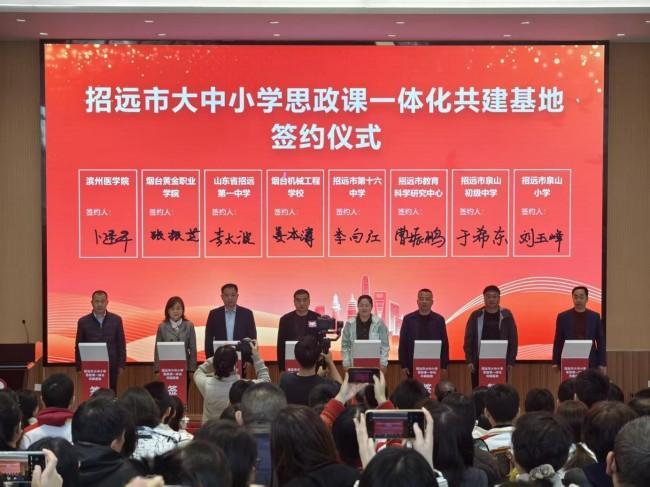 活動現場,于景科與王廣成、滕希田共同為“招遠市大中小學思政課一體化共建基地”揭牌,標志著三方合作正式啟動。隨后,學校與煙臺黃金職業學院、山東省招遠第一中學、煙臺機械工程學校、招遠市泉山初中、泉山小學、第十六中學、招遠市教育科學研究中心共同簽署《共建協議》。