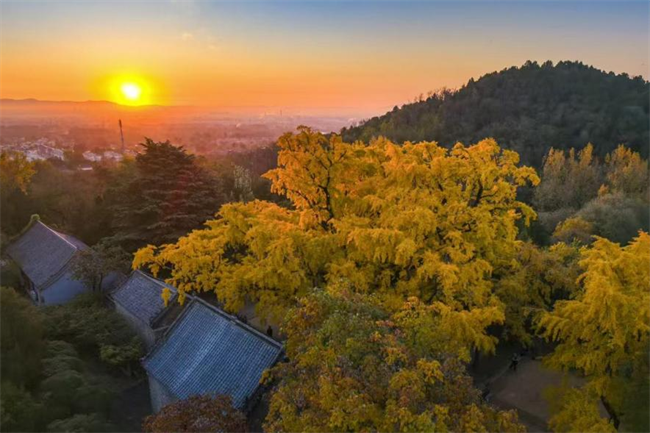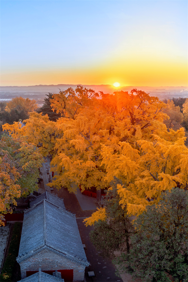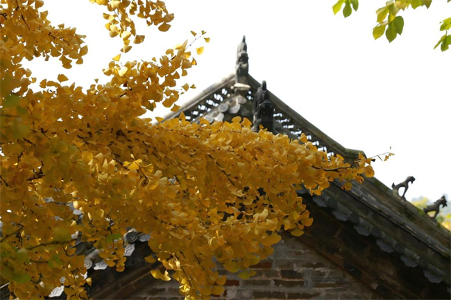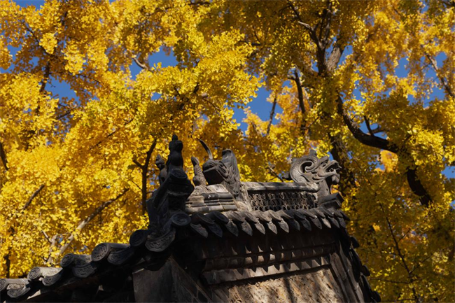 千年銀杏滿樹金黃,與古建相映成畫,秋意濃得醉人心。袁召勇/攝