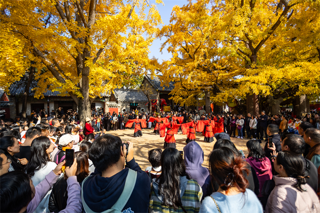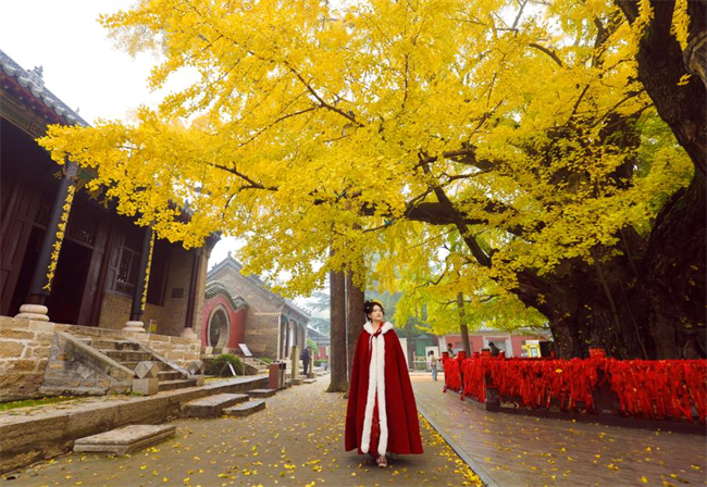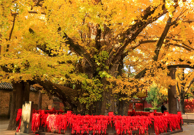千年銀杏滿冠金黃,紅綢似霞,古寺相依,秋日里盡展歲月與浪漫的交織之美。劉宗麗/攝