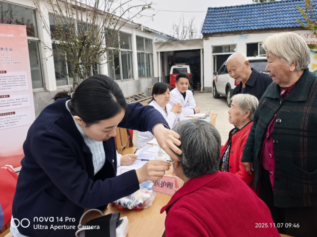 護理團隊為村民提供血壓、血糖測量、心電圖檢查及耳穴壓豆等中醫特色技術服務,讓群眾在家門口享受到三甲醫院的專業診療,真切感受到黨組織帶來的健康關懷。