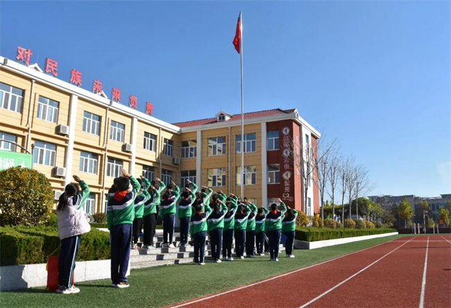 伴隨著莊嚴的國歌旋律,五星紅旗冉冉升起,全體師生肅立注目,少先隊員行隊禮,愛國情懷與文明意識在晨光中悄然扎根。