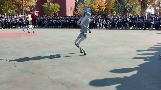 活動現場,智能機器人與機器狗在技術人員的引導下依次登場。機器人整齊劃一地完成各種舞蹈動作,機器狗則展示了“后空翻”“靈活轉向”等高難度技能,引得學生們陣陣歡呼與掌聲。