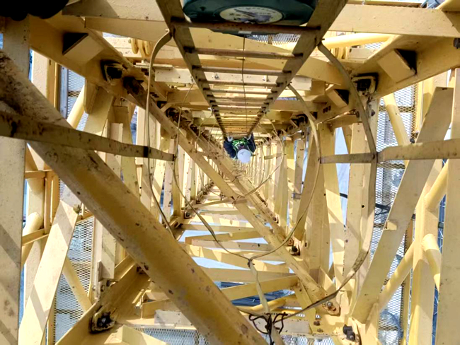 面對高空作業挑戰,檢驗人員沉著應對,逐節排查塔身標準節的連接狀況,并沿75米長的吊臂核驗每一處額定載荷標志的準確性。在高空平臺上,他們對金屬結構、工作機構、電氣系統等主體部件以及起升高度限制器、力矩限制器等安全保護裝置進行了詳細驗證,確保設備安全可靠。