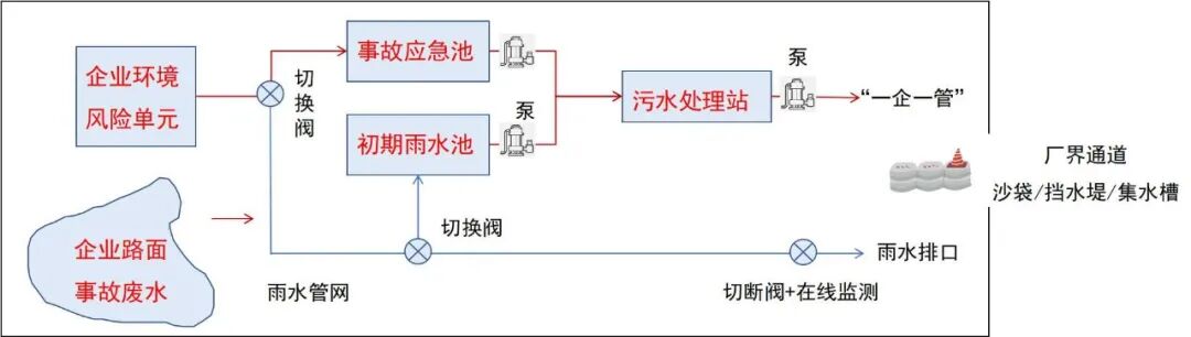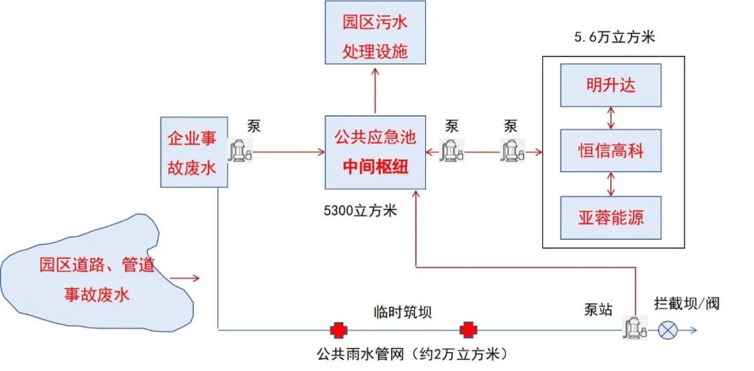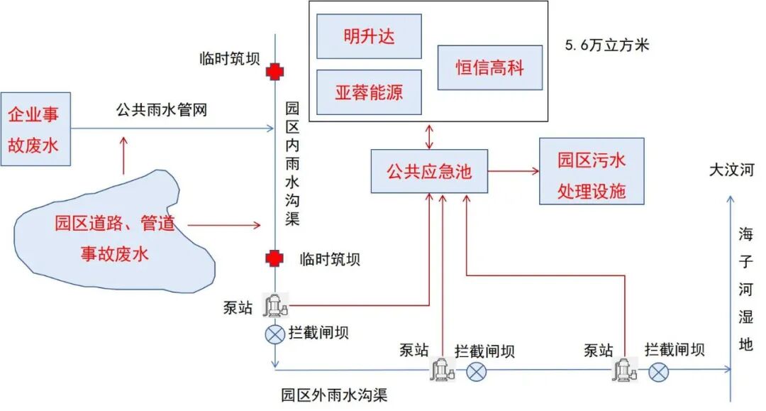 以雨水系統末端攔截轉輸、公共應急空間擴容為重點,建設完善園區第二級防控體系。在園區兩個公共雨水排口建設固定閘壩(閥)和轉輸泵站,配合雨水明渠臨時筑壩,形成2萬立方米緩沖空間,具備緊急攔截暫存和轉輸功能。依托綜合管廊架建設專門管道,將恒信高科、晉煤明升達、亞蓉能源等3家企業應急空間(5.6萬立方米)互連互通,并納入園區公共應急空間,實現所有企業事故廢水可通過園區公共應急池(中間樞紐)進入3家互連互通企業應急空間,形成覆蓋全域的事故廢水轉輸網絡。